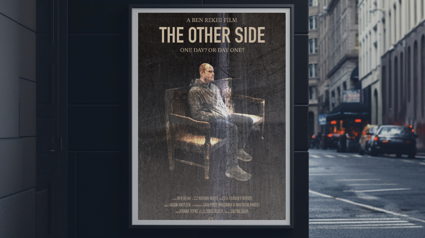 My concept was to depict an element from Zach’s bench scene mostly because I feel like this moment encapsulates the essence and tactical approach of the academy. These people come to the other side of the academy to learn the skills and rewire habits to grow as individuals, changing the trajectory of their lives. This moment where he is sitting on this bench, forced to reflect and dig deep, is so beautiful and, in my opinion, a symbol of the entire film. From an artistic perspective, I wanted to add texture and represent scars abstractly. I personally have a lot of scars on my body from various things, and I think they are so beautiful and show growth and healing. I think the human tendency is to conceal and beautify struggle; I wanted this post to make the viewer stop and feel something. The light stroke represents the light and power that comes from within, and it gets brighter as it hits him in the center. It also creates a subtle division on the poster, which creates two sides [the other side]. The tagline came from the decision to embark on change. That's the hardest part in most cases but the most important. Also, in this scene, he is forced to restart and re-enter the academy, hence the “day one.”